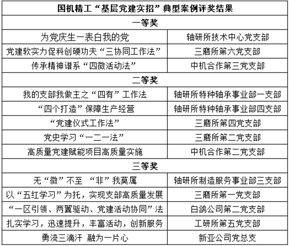 經(jīng)國機精工黨委遴選評比,公司技術(shù)中心黨支部《為黨慶生——表白我的黨》榮獲評比一等獎;特種軸承事業(yè)部一支部《我的支部我做主之“四有”工作法》、特種軸承事業(yè)部四支部《“四個打造”保障生產(chǎn)經(jīng)營》榮獲評比二等獎;制造服務(wù)事業(yè)部三支部《無“微”不至“非”我莫屬》榮獲評比三等獎;公司黨委榮獲優(yōu)秀組織獎。