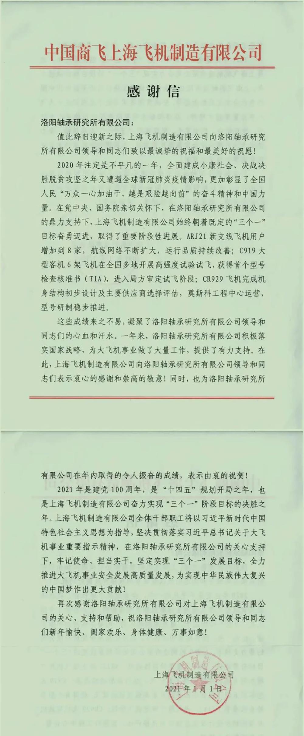 2021年1月,一封來自上海飛機(jī)制造有限公司(以下簡稱“上飛”)的感謝信對軸研所為國產(chǎn)飛機(jī)事業(yè)的支持表示衷心感謝和崇高敬意,這是對軸研所科研能力、產(chǎn)品品質(zhì)的充分認(rèn)可!