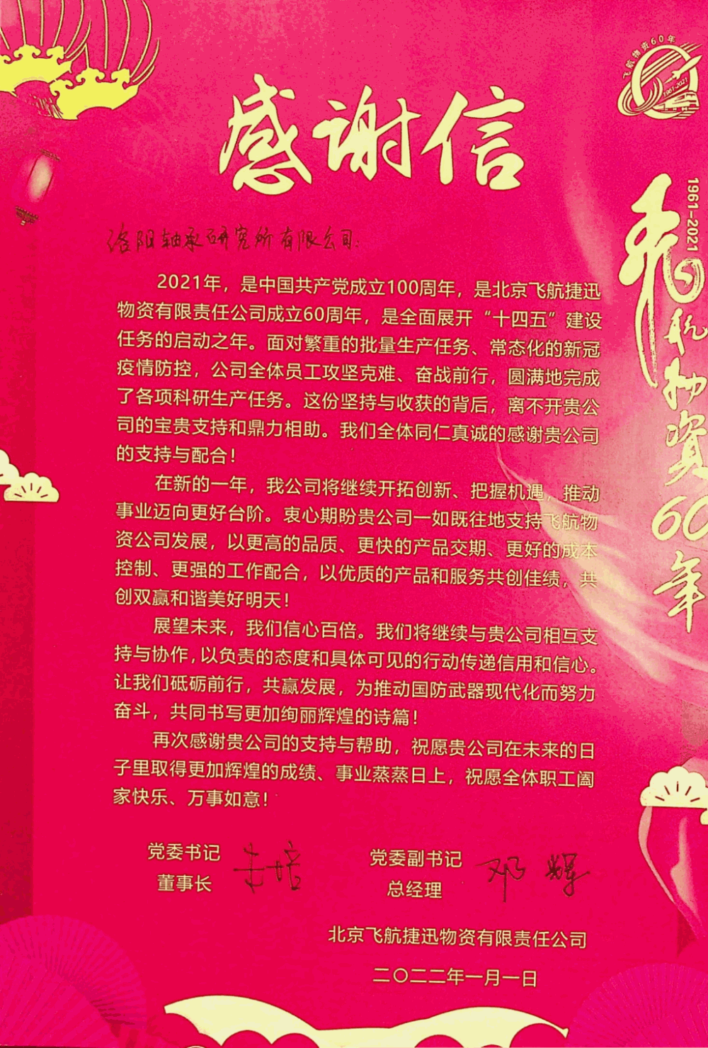 新年伊始,萬(wàn)象更新。洛陽(yáng)軸承研究所有限公司(簡(jiǎn)稱軸研所)陸續(xù)收到了5封來(lái)自航空航天客戶和軍隊(duì)工廠的感謝信。信中對(duì)軸研所長(zhǎng)期以來(lái)在軍工科研生產(chǎn)配套任務(wù)和國(guó)防武器裝備現(xiàn)代化方面給予的支持和相助表示敬意和衷心的感謝。