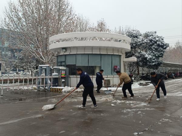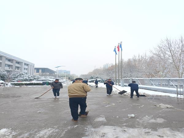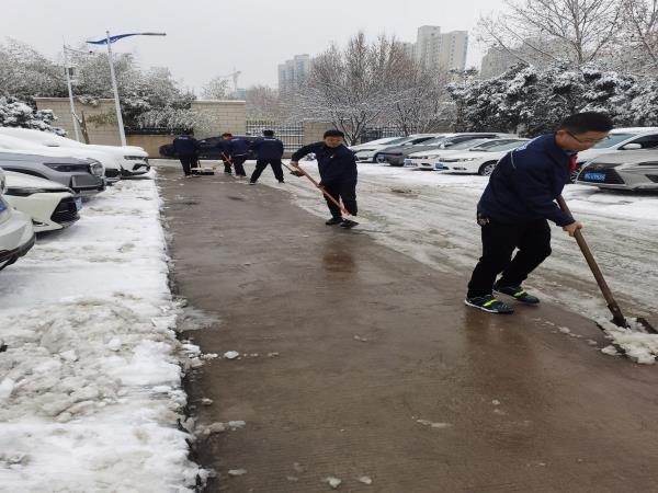 經(jīng)過簡單的分工部署,大家便拿著勞動工具投入到了掃雪除冰工作中,揮舞著鐵锨、掃帚,干得熱火朝天,不亦樂乎,忙碌的身影構(gòu)成了一道亮麗的風(fēng)景線。盡管室外溫度很低,但大家勞動的熱情和團結(jié)的力量讓這個冬日變得格外溫暖。半個多小時的奮戰(zhàn),銀白的園區(qū)里處處閃耀著“黨員紅”,最終鏟出了一條洋溢著溫情的通暢道路。