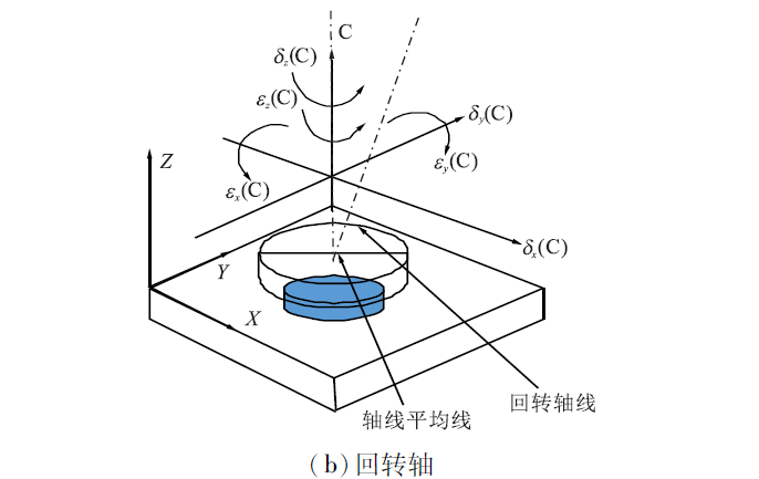 加工誤差是機(jī)床加工精度在工件上最直接的體現(xiàn)。加工誤差是指刀具實際加工軌跡與工件理論輪廓之間的偏差,幾何誤差是機(jī)床加工精度最直接、最關(guān)鍵的影響因素。如圖1所示,數(shù)控機(jī)床主要由平動軸和回轉(zhuǎn)軸構(gòu)成,以數(shù)控外圓磨床為例,各軸運(yùn)動誤差相互作用,共同影響數(shù)控機(jī)床的加工精度。
