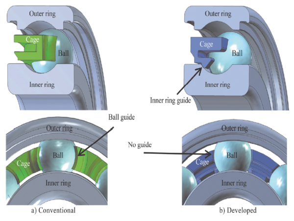 深溝球軸承多使用潤滑脂潤滑,以往通過改善潤滑脂推進(jìn)了軸承低摩擦力矩化,不過僅通過改善潤滑脂來降低摩擦力矩也是有限度的。本文介紹為降低脂潤滑深溝球軸承摩擦力矩進(jìn)行軸承內(nèi)部潤滑脂行為的可視化,獲得使脂潤滑條件下所用保持架形狀最優(yōu)化的指南。通過開發(fā)既降低潤滑脂剪切阻力及攪拌阻力,又對其他性能無影響的新結(jié)構(gòu)保持架,實(shí)現(xiàn)了低摩擦力矩化技術(shù)。