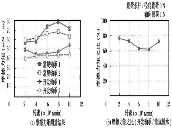 輕載條件下,在軸承摩擦力矩中潤滑脂的攪拌阻力及剪切阻力降低所占的比例大。至于使用新結(jié)構(gòu)保持架,由于大幅降低潤滑脂的攪拌阻力及剪切阻力,軸承摩擦力矩降低效果明顯。