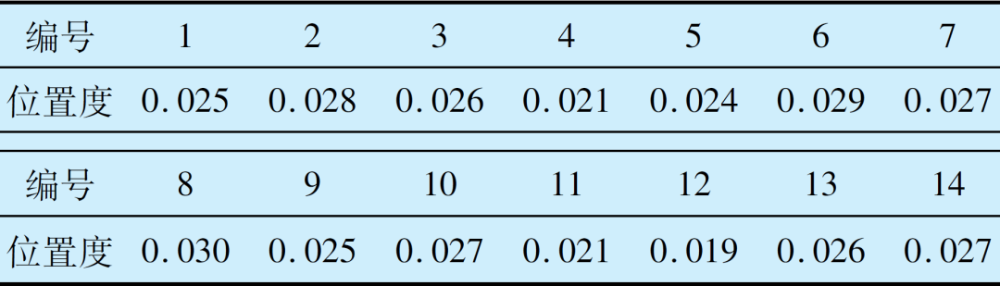 為驗(yàn)證該方法的可靠性,對(duì)該型號(hào)軸承半保持架孔位置度重復(fù)測量10次,并計(jì)算測量數(shù)據(jù)的平均值及標(biāo)準(zhǔn)差,結(jié)果見表3:14個(gè)孔位置度測值的標(biāo)準(zhǔn)差最大為0.001 mm,離散性較低,測量數(shù)值可靠;測值不確定度不超過0.003 0 mm,同樣說明該方法的測值準(zhǔn)確可靠。