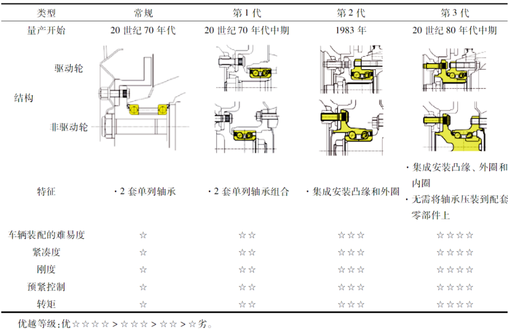 NTN輪轂軸承單元的演變和特點見表1,包括使用2套單列軸承的時代(在單元化開始前)。