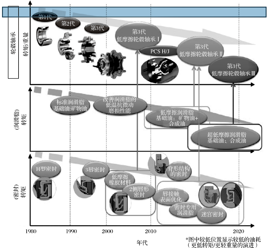 降低輪轂軸承單元的轉(zhuǎn)矩一直是提高車輛燃油效率的要求,但因為許多國家出臺了環(huán)境法規(guī),要求變得越來越嚴格。NTN開發(fā)了各種低轉(zhuǎn)矩產(chǎn)品,以應(yīng)對輪轂軸承應(yīng)用的市場需求。輪轂軸承降低轉(zhuǎn)矩的發(fā)展歷程如圖3所示。
