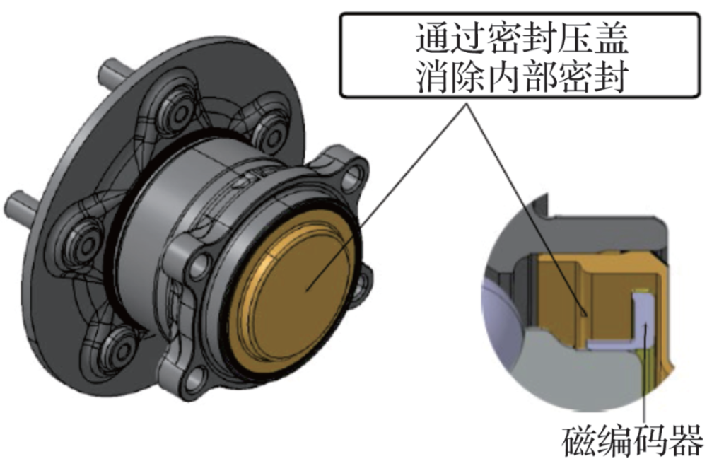 對于驅(qū)動輪,CVJ不必嵌入到內(nèi)徑。因此,如圖4所示,采用一種壓蓋密封內(nèi)側(cè)(車輛側(cè))的設(shè)計,消除了常規(guī)裝置的2個密封中的1個,從而顯著降低了轉(zhuǎn)矩。