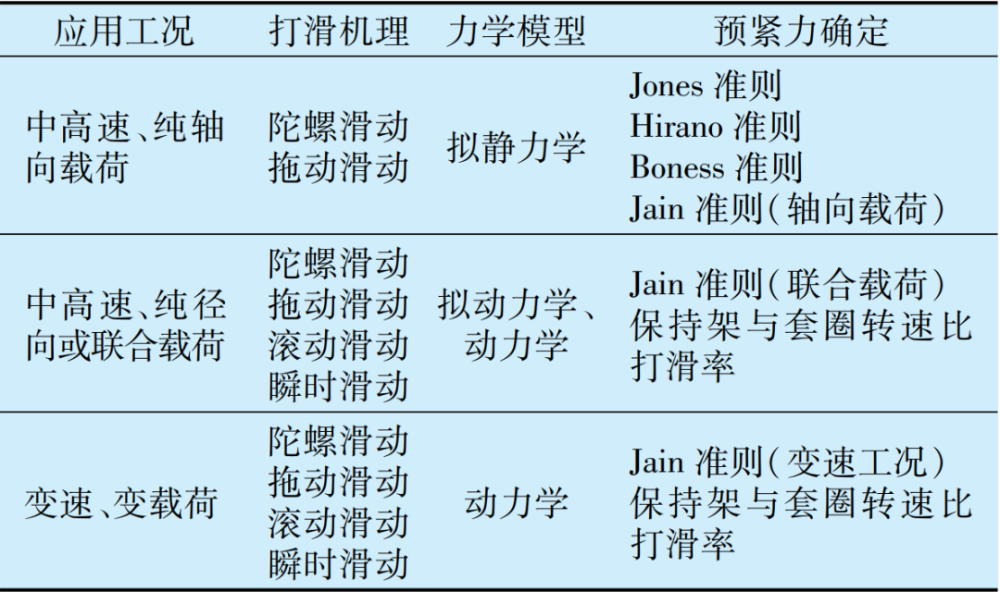 工程實(shí)際中預(yù)防軸承打滑最常用的方式是施加預(yù)緊力。對(duì)軸承施加合適的預(yù)緊力,一方面可防止軸承打滑,降低摩擦發(fā)熱和磨損,提高軸承使用壽命;另一方面,軸承預(yù)緊力影響轉(zhuǎn)子系統(tǒng)的支承剛度和固有頻率,從而影響軸承–轉(zhuǎn)子系統(tǒng)的動(dòng)力學(xué)響應(yīng)。針對(duì)不同應(yīng)用工況,表1總結(jié)了以防止球軸承打滑為目標(biāo)的最小預(yù)緊力的確定方法。