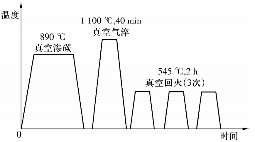 殲–20戰(zhàn)斗機(jī)和C919大飛機(jī)的先后問世代表了我國航空工業(yè)的崛起,而飛機(jī)機(jī)動(dòng)性的每一次提升主要依靠發(fā)動(dòng)機(jī)推重比的增加,如今發(fā)動(dòng)機(jī)主軸dn值已經(jīng)達(dá)到2.4×106 mm·r·min-1,發(fā)動(dòng)機(jī)主軸軸承的工作溫度逼近300 ℃,且長期承受巨大的沖擊載荷和循環(huán)疲勞應(yīng)力。為適應(yīng)航空軸承更高的性能要求,我國研發(fā)了第2代高溫滲碳軸承鋼G13Cr4Mo4Ni4V(ASTM M50NiL)。根據(jù)YB/T 4106——2000《航空發(fā)動(dòng)機(jī)用高溫滲碳軸承鋼》規(guī)定,其經(jīng)過滲碳、淬火和回火處理后的表層硬度可達(dá)到62~63 HRC,具有較高的耐磨性和良好的抗疲勞性能,心部板條馬氏體提供了良好的沖擊韌性。圖7所示為G13Cr4Mo4Ni4V鋼常用的滲碳熱處理工藝,真空滲碳時(shí)的溫度一般為890 ℃,然后經(jīng)1 100 ℃淬火,再545 ℃回火處理3次,每次2 h。