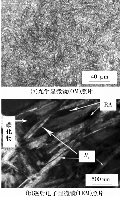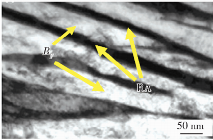 文獻(xiàn)[72]對(duì)20CrMnMoAl滲碳軸承鋼在220 ℃下等溫淬火 32 h后幾乎得到了全貝氏體組織(圖10),TEM觀察發(fā)現(xiàn),在貝氏體鐵素體條之間存在著僅十幾納米厚的殘余奧氏體薄膜,由于Al對(duì)碳化物的抑制作用,等溫過程中貝氏體鐵素體中的碳原子大量擴(kuò)散至薄膜狀殘余奧氏體中,因此薄膜狀殘余奧氏體的穩(wěn)定性更高,這對(duì)軸承尺寸精度的控制有一定益處。