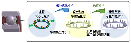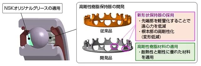 NSK通過新開發(fā)的潤滑脂和樹脂保持架,實現(xiàn)了dm·n值140萬的高速旋轉(zhuǎn)工況(軸承內(nèi)徑:35 mm;轉(zhuǎn)速:30000r/min),如圖3所示;今年NSK又推出了第三代世界最高轉(zhuǎn)速、電動車驅(qū)動電機用高速球軸承(圖4)。