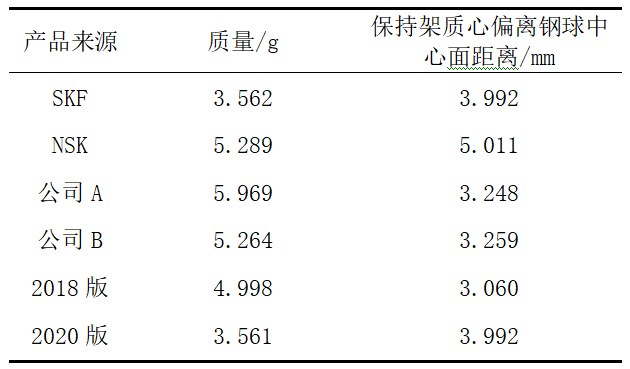 以深溝球軸承6307為例,上述列舉的保持架基礎(chǔ)數(shù)據(jù)對比見表1。