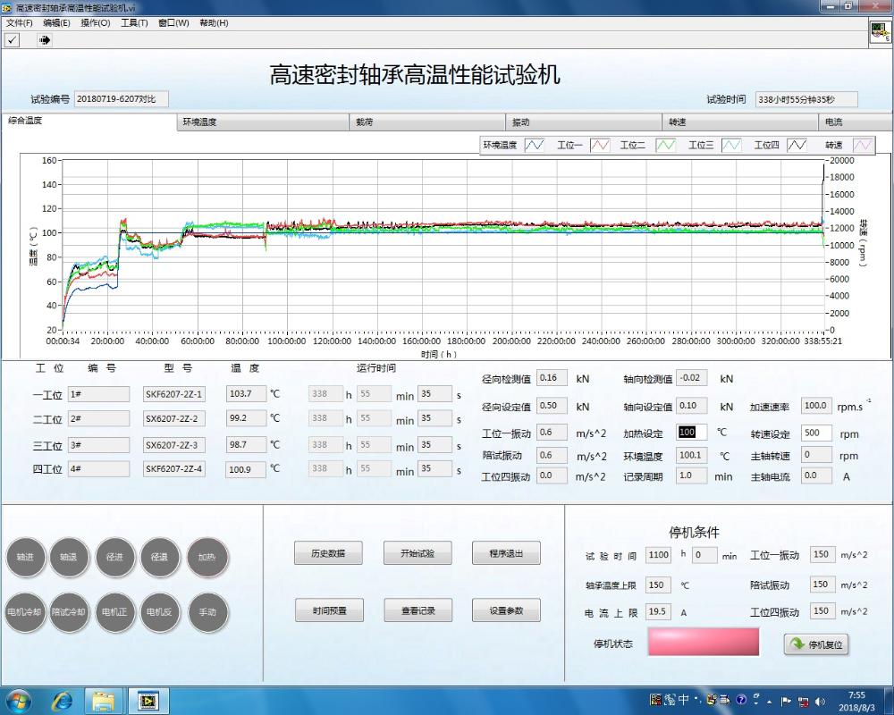 試驗運行情況如圖15所示,試驗連續(xù)運行時間為930h。對比試驗的SKF同類型鐵蓋密封軸承僅運行338h(如圖16)。