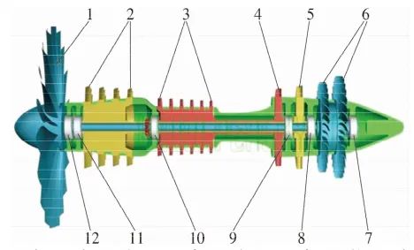 1-風(fēng)扇;2-中壓壓氣機(jī);3-高壓壓氣機(jī);4-高壓渦輪;5-中壓渦輪;6-低壓渦輪;7,12-低壓軸承;8,11-中壓軸承;9,10一高壓軸承。